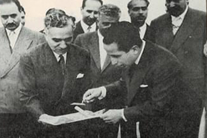 Dr. Dhia Jafar as Minister of Development launching several major infrastructure projects with HM King Faisall II and Crown Prince Abdulilah, Iraqi Development Week 1957.
